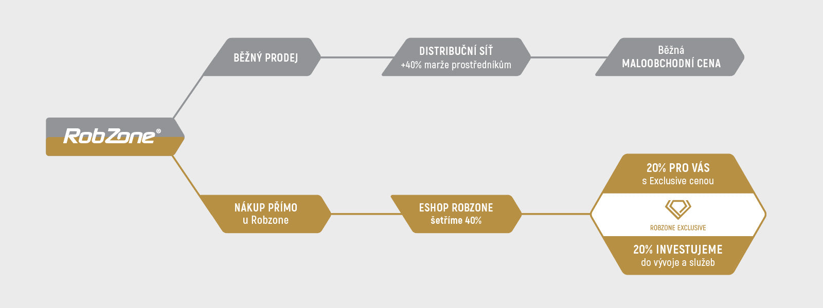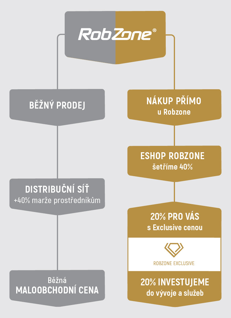 Často se nás ptáte, jak je možné, že naše roboty nenajdete v různých elektro-marketech nebo řetězcích. Rozhodli jsme se jít nestandardní, ale věříme že správnou cestou s výhradně vlastní distribucí přes www.robzone.cz. To nám umožňuje nabízet vám výhodnou Exclusive cenu nebo mimořádnou akční cenu, protože nemusíme platit marže distributorům, které dosahují až 40%. Rádi se o úspory z toho, co bychom zaplatili přeprodejcům podělíme. Vy tak získáte exclusive cenu nižší o 20% a my zbylých 20% můžeme využít na vývoj robotů a zlepšování služeb.
