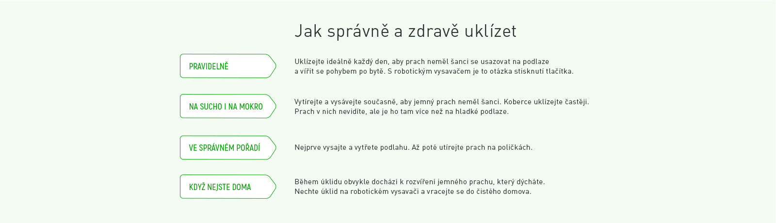 Jak máme doma čisto, kolik prachu se kolem nás generuje a usazuje se jednoznačně odráží v kvalitě vzduchu, který dýcháme. Nejvíce škodlivým je okem neviditelný jemný prach, který se zvíří při jakémkoliv pohybu místností a s každým nádechem se dostává do až plic. Poslední studie Hunting Dynasty* potvrzuje, že čistá domácnost má velkou zásluhu nejen na našem zdraví, ale přispívá i k celkovému pocitu pohody a štěstí.