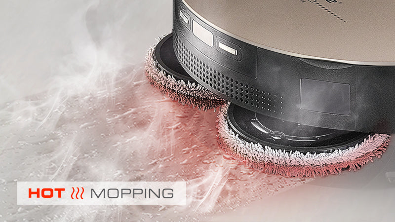 Při najetí na koberec robot automaticky zvedne mopy, zesílí sací výkon a plynule pokračuje v úklidu. Mopy zvedne až do výšky 1,5 cm . Naopak na hladké podlaze se rychlootáčkové rotační mopy díky silnému přítlaku k podlaze poperou i s přischlými nečistotami. Přítlak ve výši 15N odpovídá zatížení neuvěřitelnému 1 kg.