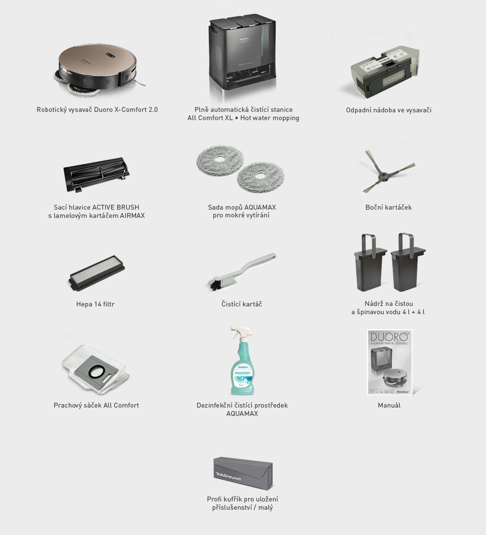 Robzone DUORO X-COMFORT 2.0 · Akumulátor Li-Ion 5200 mAh (instalováno ve vysavači) · Plně automatická čistící stanice All Comfort XL · Napájecí kabel · Odpadní nádoba (instalováno ve vysavači) · Vodní nádržka (integrovaná) · Nádrž na čistou vodu 4 l (instalováno ve stanici) · Nádrž na špinavou vodu 4 l (instalováno ve stanici) · Sací hlavice ACTIVE BRUSH s lamelovým kartáčem AIRMAX (instalováno ve vysavači) · Sada mopů AQUAMAX pro mokré vytírání · Boční kartáček (1 ks, instalován ve vysavači) · Hepa 14 filtr (instalován ve vysavači) · Prachový sáček All Comfort (instalován ve stanici) · Čistící kartáč