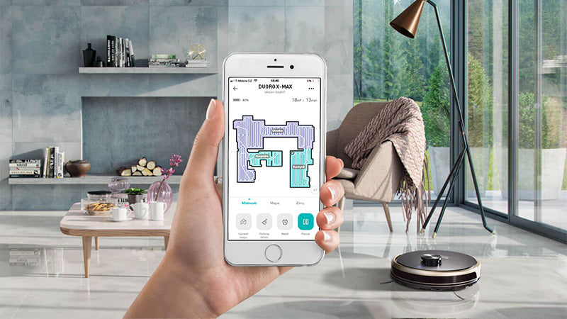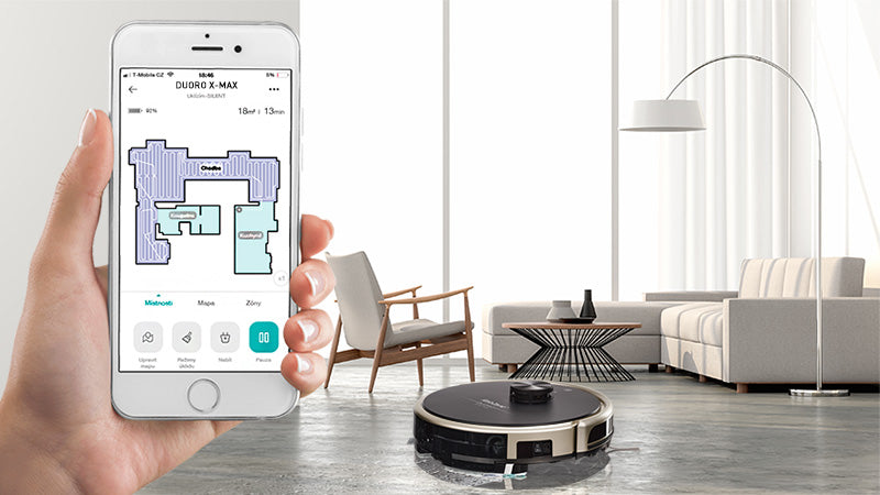 Svého robota můžete kontrolovat a ovládat online přímo ze svého mobilu. Navíc s vámi bude Duoro komunikovat vždy česky. Automatické nabíjení a programování úklidu na celý týden dopředu je samozřejmostí.