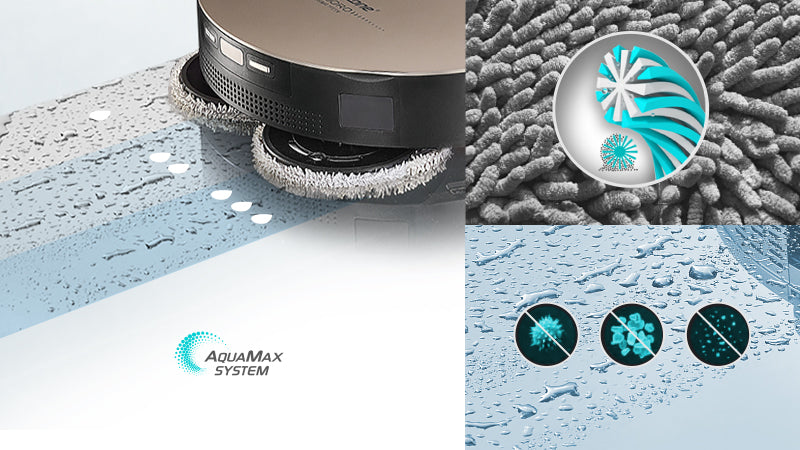 Unikátní systém Aquamax výrazně zlepšuje kvalitu vytírání. Speciální mop je vyroben ze štěpeného mikrovlákna Addsorb Fibre, které dokáže navázat mnohonásobně víc nečistot než jiné textilie. Špínu uzamkne uvnitř vláken a na povrch propouští jen čistou vodu. Elektronické dávkování vody umožňuje nastavit intenzitu vytírání podle typu podlahy a jejího znečištění. Použitím Aquamax spreje zbavíte podlahu všech nečistot včetně 99,9% bakterií, virů a plísní. Navíc bude po úklidu vonět nejen podlaha, ale i celý váš domov.