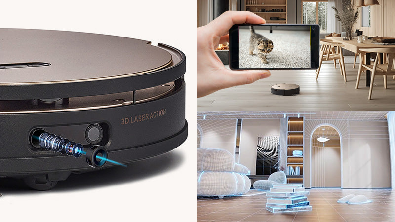 Rozpoznávání překážek nikdy nebylo tak přesné. Díky technologii 3D Laser Action robot neomylně detekuje i velmi malé předměty a obratně se jim vyhne. Chcete vidět, jak si robot během úklidu vede? Zapněte si kameru s bezpečným přenosem dat a v reálném čase můžete vidět, co se doma děje. Kameru můžete sami vypínat a zapínat podle potřeby bez obav o vaše soukromí.