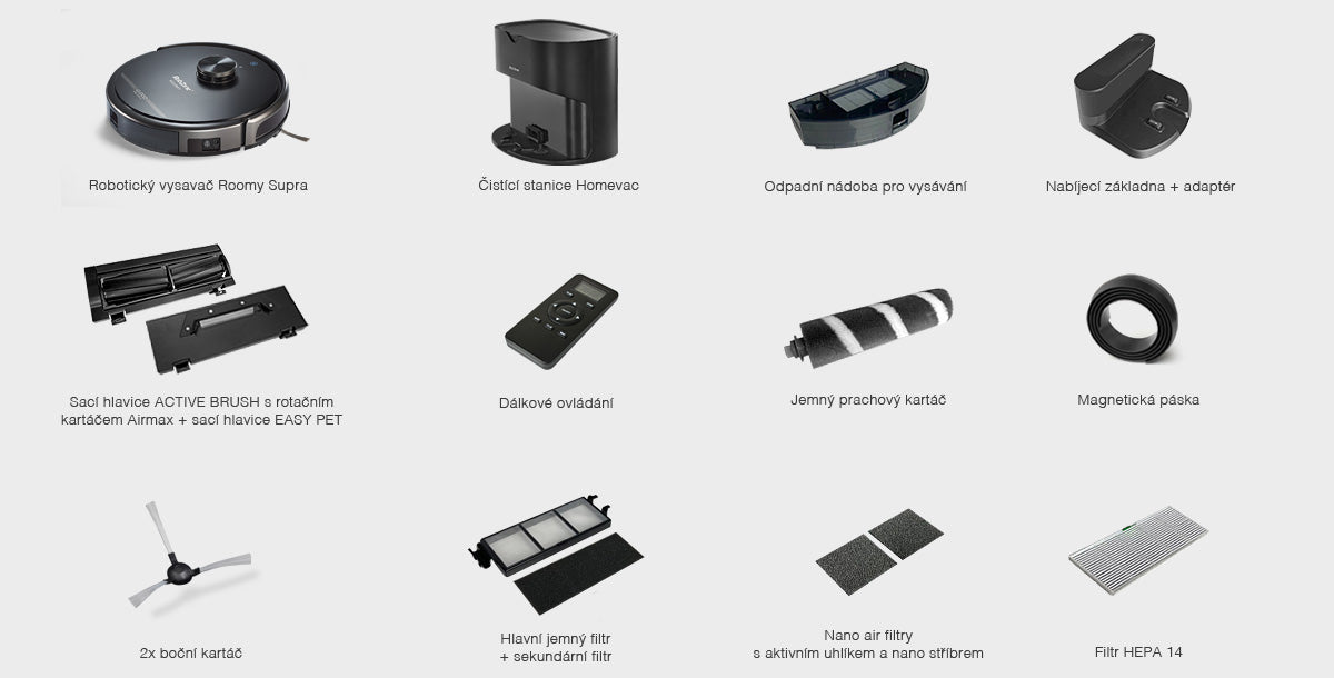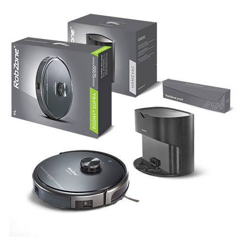 Roomy Supra je výkonný robotický vysavač se specializací na důkladné vysávání koberců a hladkých podlah. Díky inteligentní funkci Boost Effect ihned rozpozná znečištěný koberec a automaticky zahájí hloubkové turbo sání. Na hladké podlahy je vybaven speciálním Anti-Dust systémem, kdy pomocí speciálního kartáče v kombinaci filtrací Nano Air zbaví podlahu až 99,97% toho nejjemnějšího prachu. Neuniknou mu ani prachové chuchvalce v rozích a podél stěn.